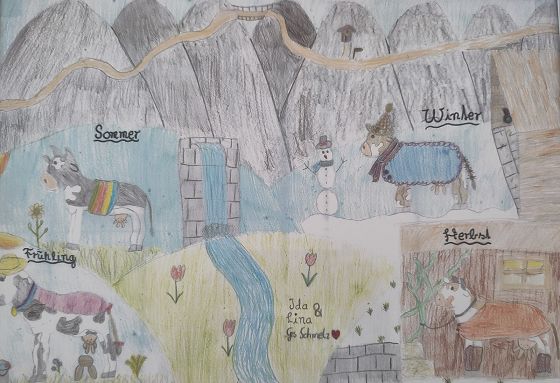 Beim Betrachten des Gewinnerbildes von Lilith (Klasse 4, Freie Waldorfschule Saar-Hunsrück) ist der Jury direkt eine Modenschau in den Sinn gekommen: „Bühne frei für die Modetrends der modernen Milchkuh 2026: Ob Frühling, Sommer, Herbst oder Winter – die Kuhmodels zeigen euch schon heute, was die Milchkuh von morgen trägt!“ Der Jury hat besonders gut gefallen, dass nicht nur die Kleider verschieden sind, sondern auch die gezeigten Kühe. Holstein, Braunvieh, Jersey – die Diversität ist auch im Kuhstall angekommen und für jede Kuh gibt es das passende Outfit. Die dazu ergänzenden Accessoires runden euer Outfit ab: Ein Osternest im Frühjahr, eine Sonnenbrille im Sommer, Regenschirm im Herbst und Stiefel und Schal im Winter. Die Posen der Kuhmodels harmonieren mit den Outfits und haben die Jury zum Lachen gebracht.