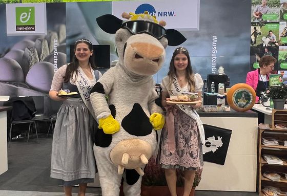 Bad Kreuznach, 26. Januar 2026 – mit einem genussvollen, regionalen „Milchpicknick“ zwischen der Hessischen Milchkönigin Hanna I. sowie der Milchkönigin Rheinland-Pfalz-Saar Anne Schmillen feierte das NRW-Milchmaskottchen Kuh Lotte die regionale Vielfalt auf der Grünen Woche in Berlin 2026.
