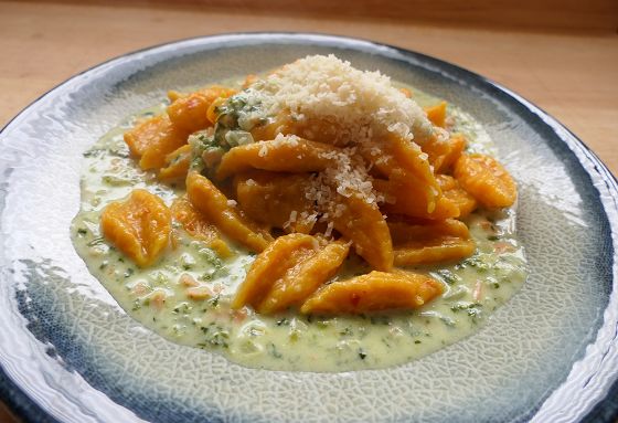 Butter und Öl in einem Topf schmelzen lassen. Zwiebel schälen und in Würfel schneiden. Im Fett andünsten - nicht anbraten! Räucherlachs hinzugeben und auch andünsten (nicht braten). Mit Weißwein und Sahne ablöschen und mit Gemüsebrühe würzen. Spinat hinzugeben und köcheln lassen. Mit Speisestärke abbinden. Dazu die Speisestärke in etwas kalter Flüssigkeit auflösen und dann in die kochende Soße geben. Einköcheln lassen. In der Zwischenzeit kann Nudeln oder Gnocchi gekocht werden. Dazu passt etwas Parmesan.
